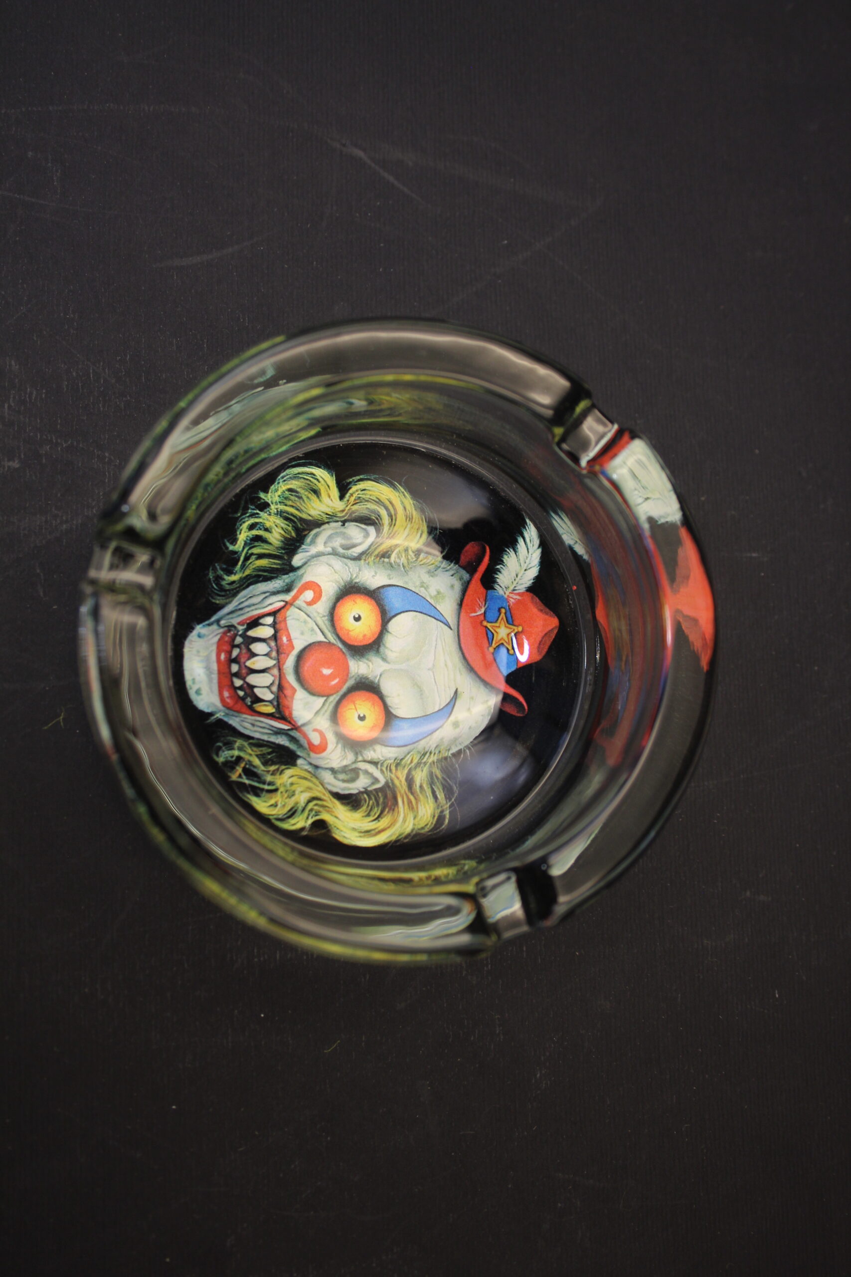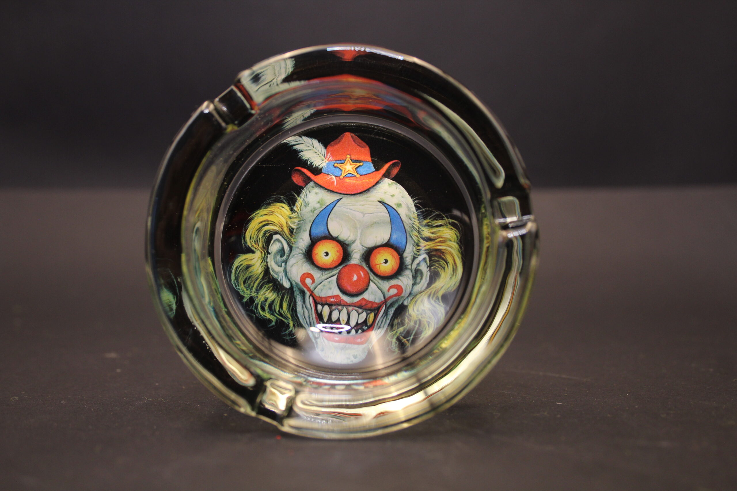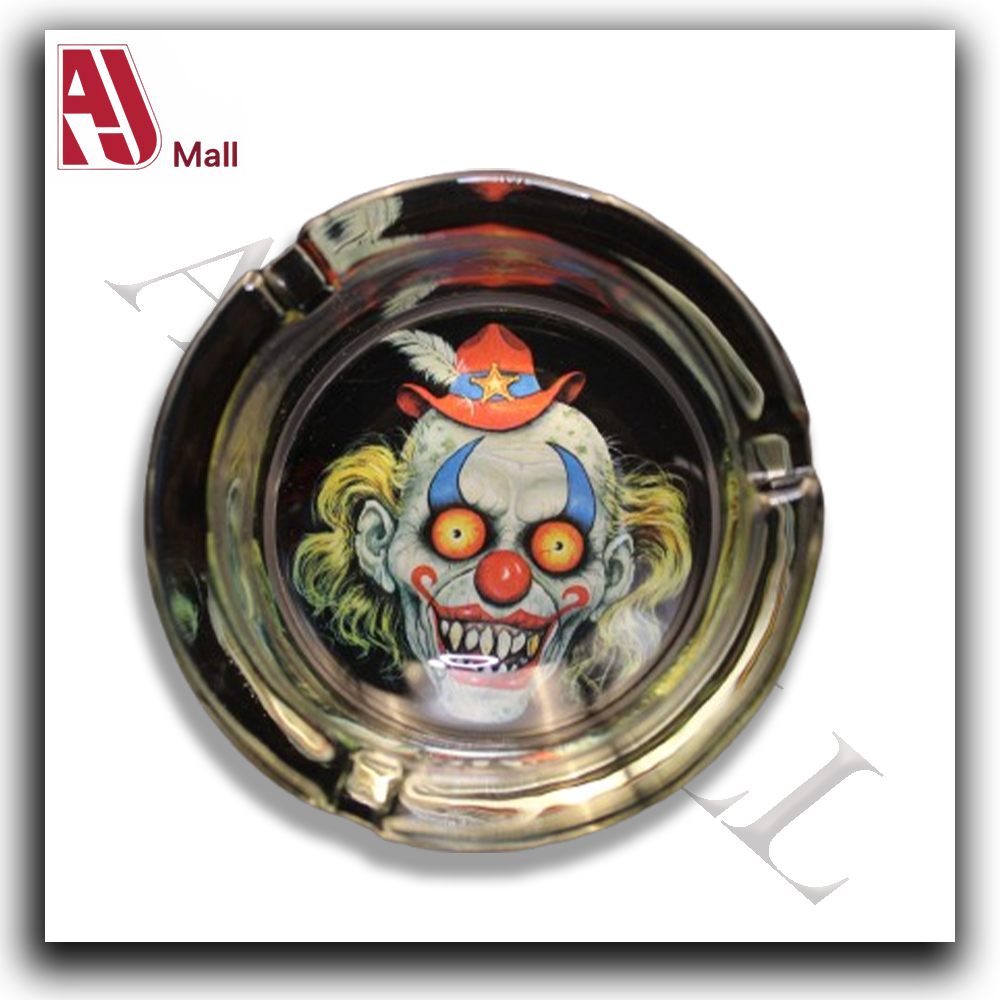 Apportez une touche d’originalité à votre espace fumeur avec ce cendrier en verre décoré d’un clown au regard effrayant. Son design surprenant en fait un accessoire parfait pour une soirée à thème ou une décoration décalée.