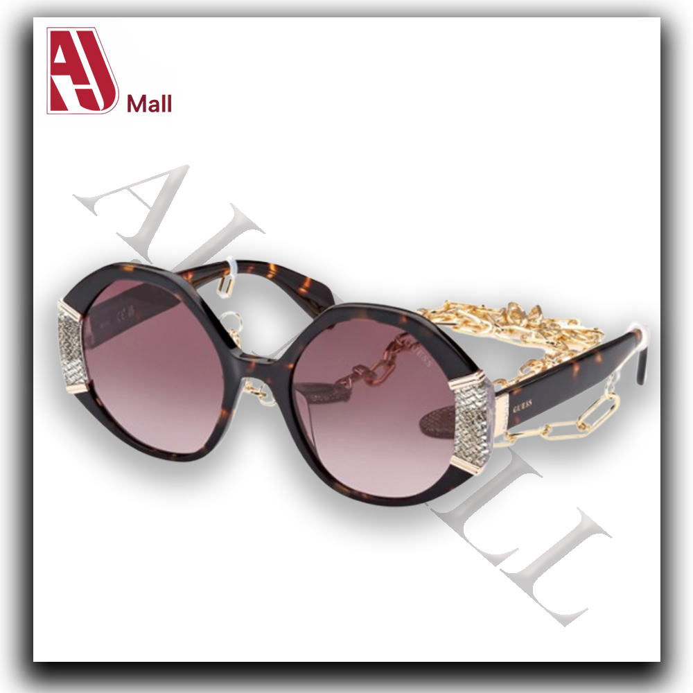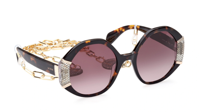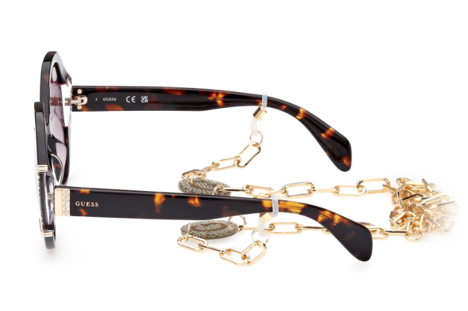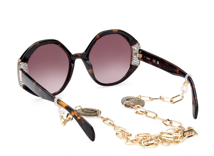 Lunettes de soleil rondes GUESS avec chaîne dorée – Monture écaille et strass