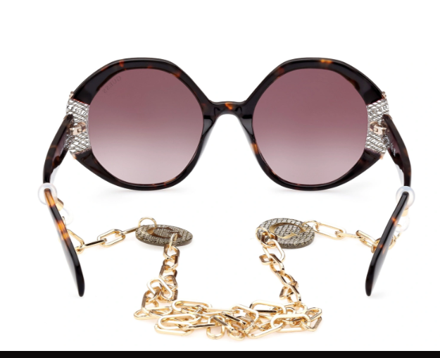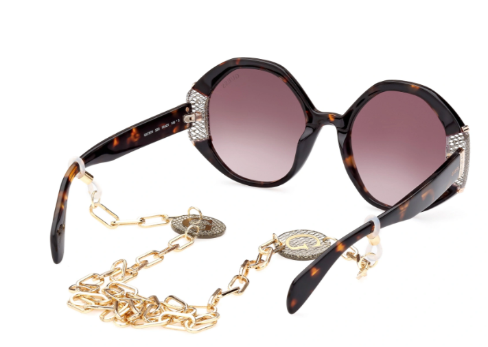 Affirmez votre style avec ces lunettes de soleil rondes GUESS au design luxueux. Monture écaille ornée de strass scintillants sur les côtés et chaîne dorée détachable pour un effet bijou chic. Verres dégradés pour une protection optimale avec une touche glamour. Parfaites pour celles qui aiment se démarquer avec élégance.